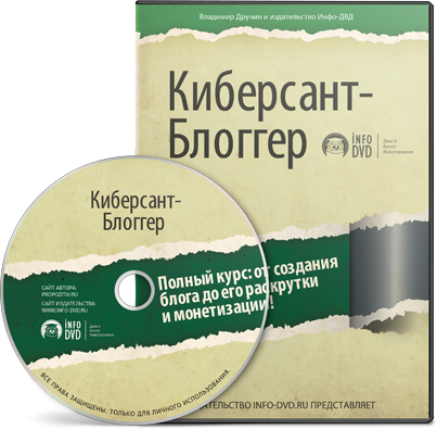Видеокурс «Киберсант-Блоггер. Полный курс: от создания блога до его раскрутки и монетизации!» Хватит завидовать и жаловаться на жизнь! Пора создавать собственный успешный бизнес в Интернете! Кто еще хочет стабильно и гарантированно зарабатывать на блоге, превращая свои идеи в реальные деньги? Преуспевать и быть знаменитым! «Рубить» сотни, тысячи, десятки тысяч долларов на собственных блогах, работая при этом не более 3х часов в день! Это уникальное пособие, которое разработано, исходя из собственного опыта и знаний автора-практика. Это первый и единственный в русскоязычном Интернете видеокурс, полностью раскрывающий все этапы создания и ведения б